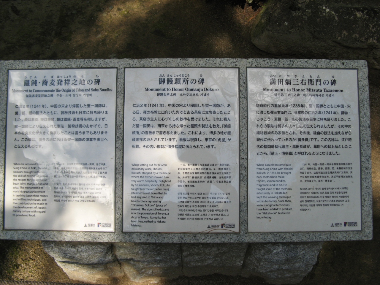 博多の街を散策したときに「承天寺」に寄せてもらいました。場所は地下鉄「祇園駅」から徒歩5分ぐらいのところです。「承天寺」は、博多の夏祭りとして全国的に有名な“博多祗園山笠”の発祥の地だそうで、他にも、うどん・そば・羊羹・饅頭などの製法が最初に伝えられた場所とも云われています。訪問したときは、ボランティアさんが“饂飩蕎麦発祥之地”“山笠発祥之地”“饅頭発祥之地”の石碑について解説してくれたり、見事な石庭を案内してくれました。大都会の中のオアシスの様な、静かで落ち着いた雰囲気を持つお寺さんでした。