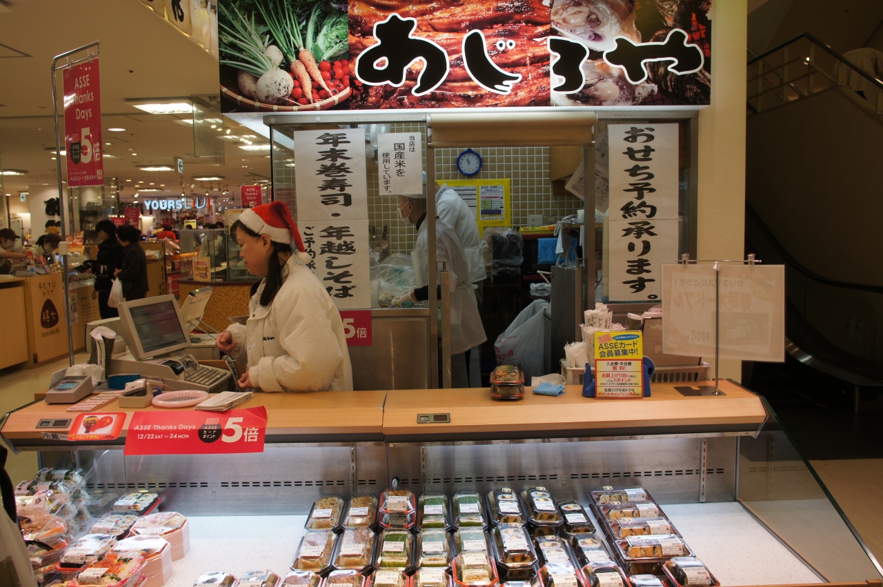 アッセは、広島の駅ビル。最近は、東京でも単純な駅弁を買う代わりに、近くのデパ地下で、食べ物をちょい買いする傾向が強くなっていると思います。そいうい役割でいうと、広島なら、このアッセ。写真は、駅の改札階からエスカレーターを降りてすぐのお寿司の弁当屋さんですが、私もこれまで何度か利用させてもらってま~す。