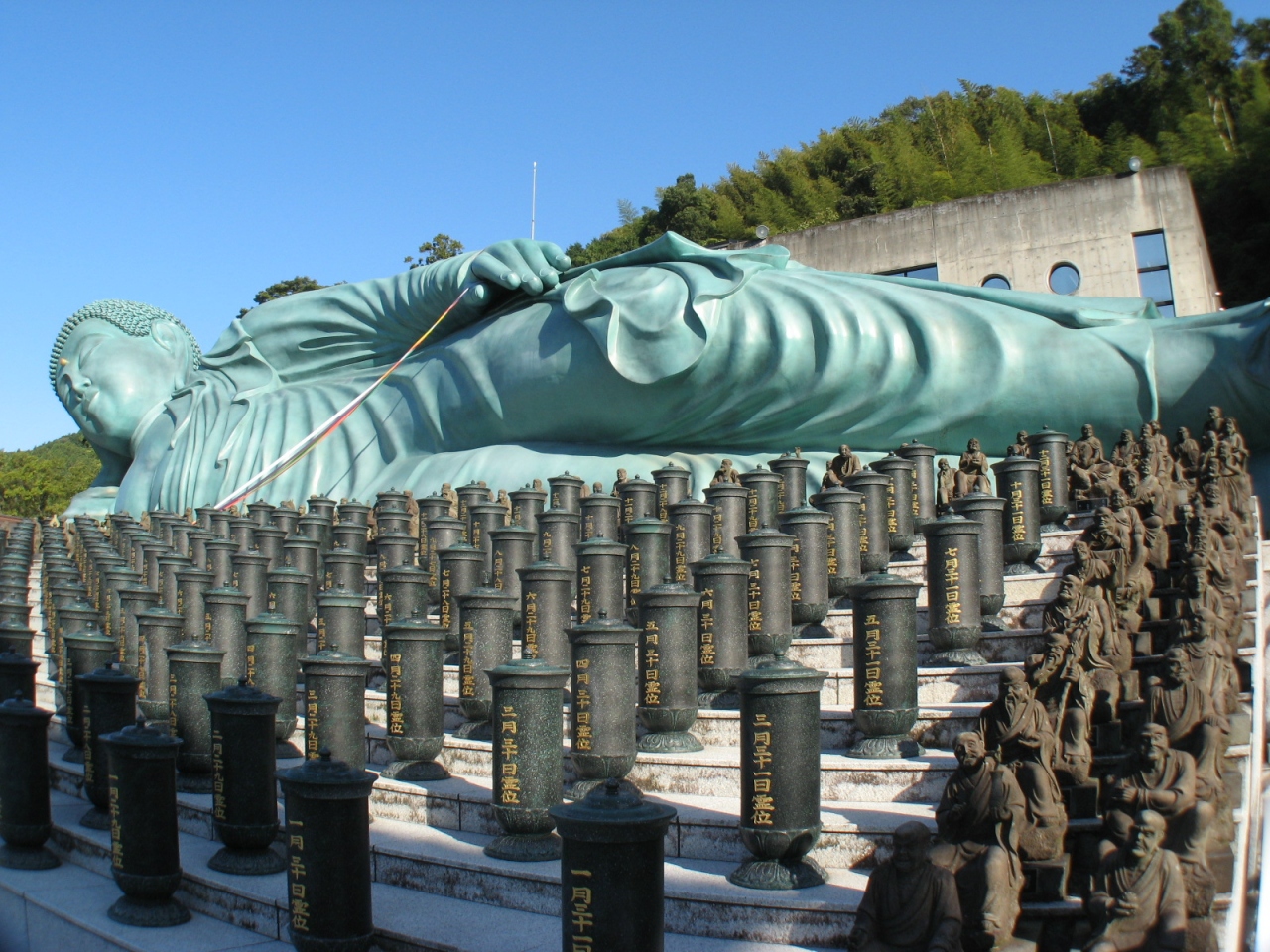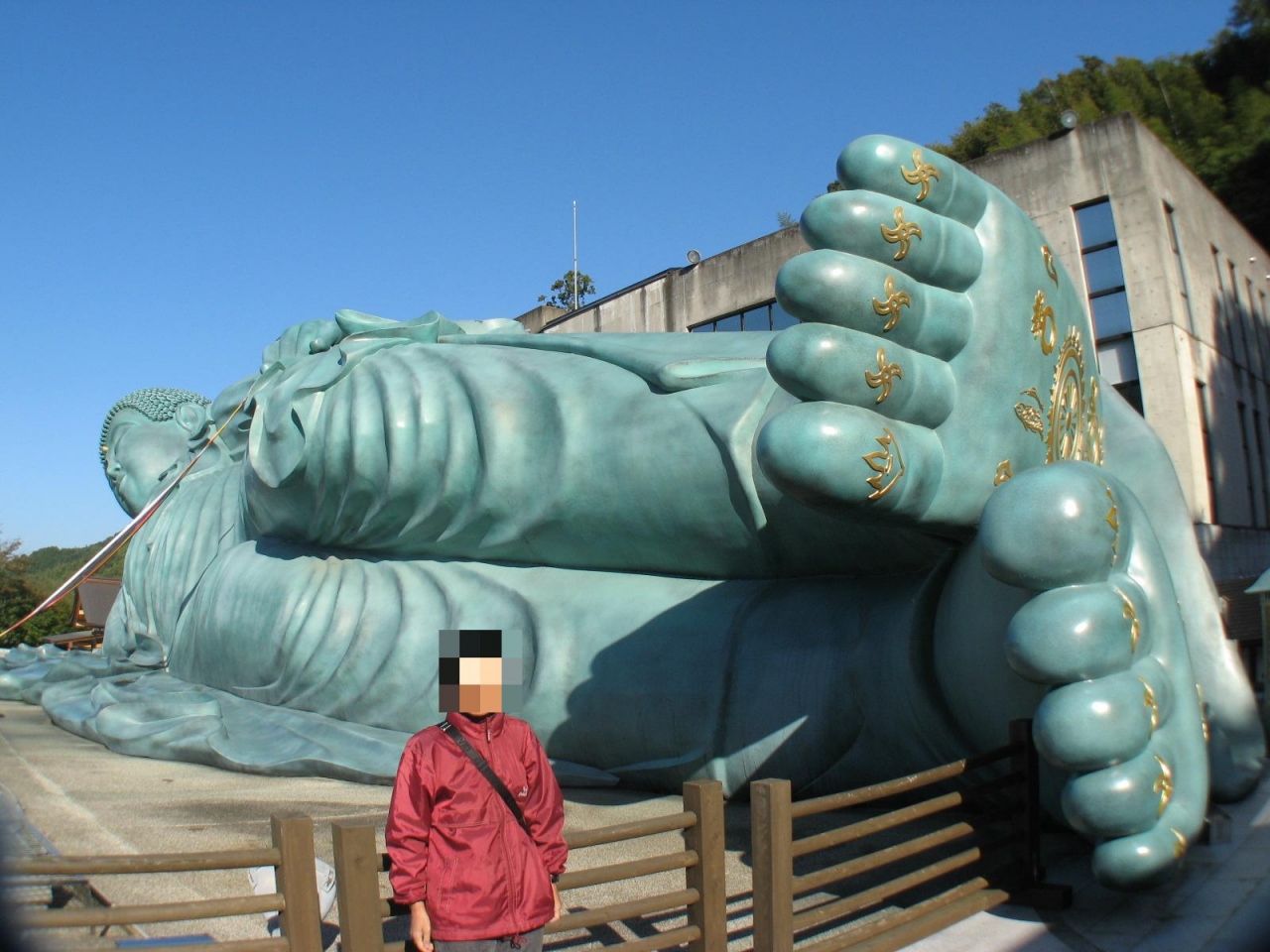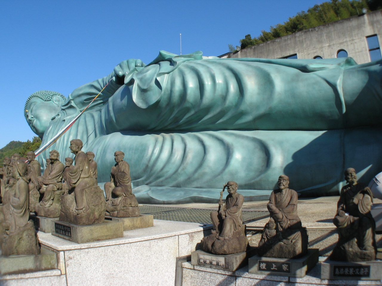 九州一周旅行で、博多から田川に行く途中に「南蔵院」を訪れました。場所は、JR篠栗線の城戸南蔵院前駅の向いの国道201号線沿いにあります。国道沿いの駐車場から、境内を登っていきますと、途中に地蔵様、さば大師、大黒天、不動明王等様々な神様が祀られています。その先には、全長41m、高さ11m、重さ300トン、ブロンズ製としては世界最大の涅槃像が横たわっていました。この涅槃像はミャンマーやネパールで長年福祉活動をしてきた「南蔵院」に対して、ミャンマーの仏教会から贈られた仏舎利を収めるために作られたものだそうです。兎に角、その涅槃像の大きさに驚かされました。地元では“篠栗のねぼとけさん”として人々の“心のよりどころ”となっているそうです。