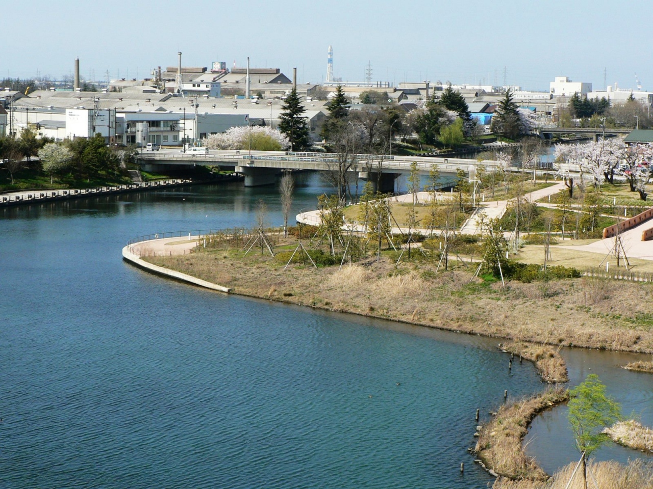 富山市の富岩運河環水公園(ふがんうんがかんすいこうえん)は、1988年に策定されたとやま都市MIRAI計画のシンボルゾーンとして、富岩運河の牛島町側の漁船、はしけなどの小型船のたまり場・船だまりを整備した公園で両岸を結び、2つの展望塔を持つ天門橋が設けられている。展望塔からは環水公園全体が一望でき、立山連峰が美しく見えた。