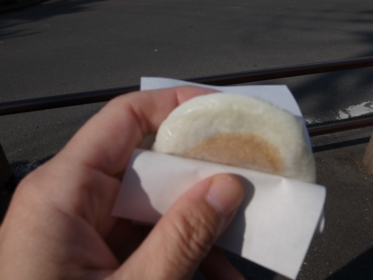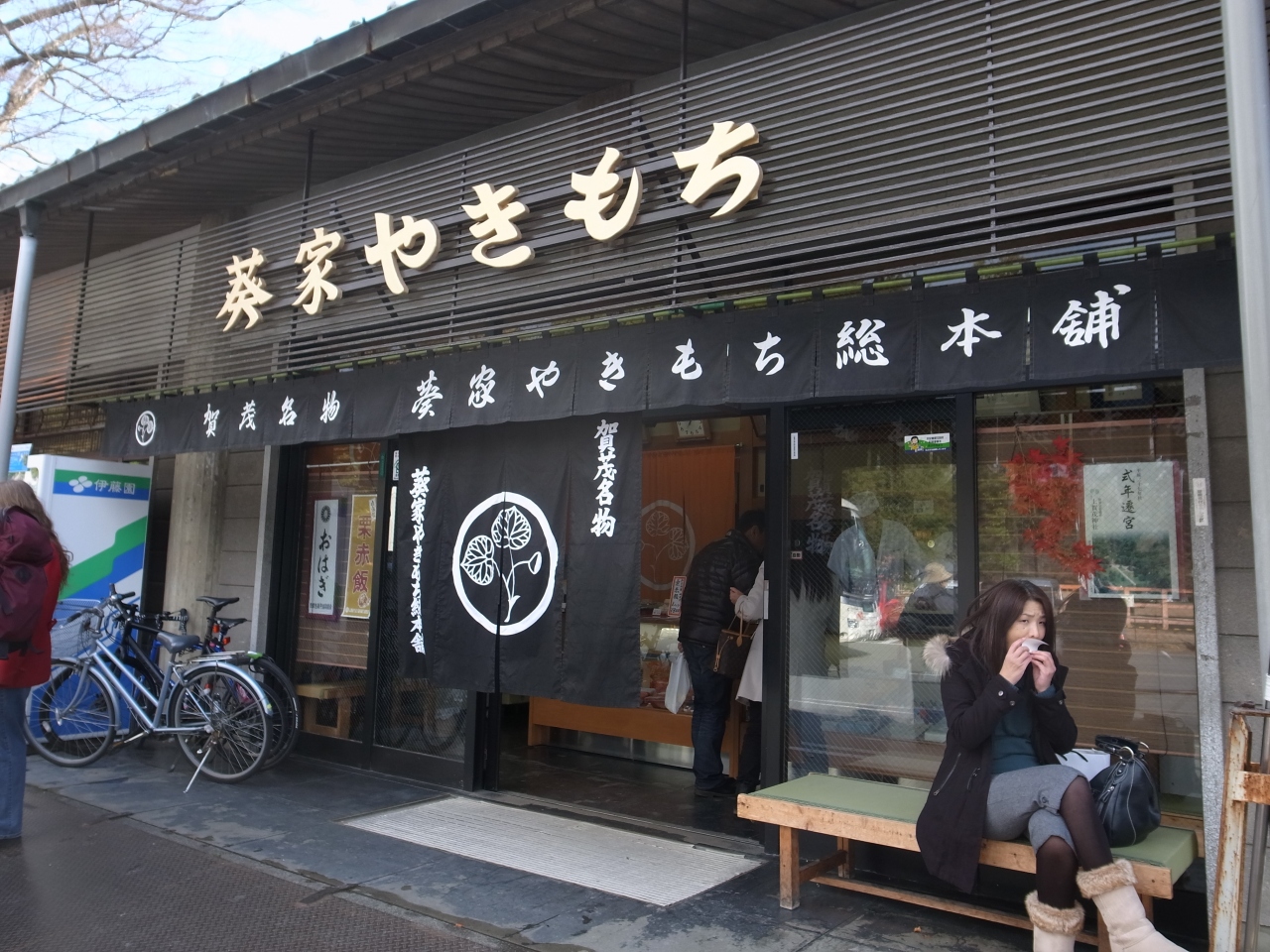 上賀茂神社の門前には、やきもちのお店が数軒ありますが、市バスや観光バスを利用する観光客が買いやすいのは、駐車場側にあるこの店です。私も市バスが来るまでの待ち時間に購入して食べてみました。熱々のやきもちは、冬の散策には有り難かったです。