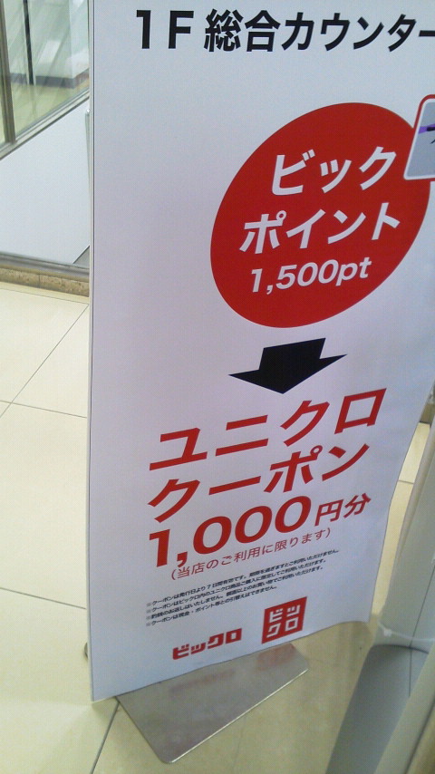 家電のビックカメラと、カジュアルファッションのユニクロのコラボレーション店です。話題の店と言うことで、ものすごい人出で賑わっていました。ユニクロは売り場も広いのですが、同じ商品がいたるところに置いてあったり、売り場の場所が少しわかりにくい感じがしました。ビックカメラのポイントで、ユニクロのクーポンに引き換えられるサービスをやっており、これは良いサービスだとおもいました。