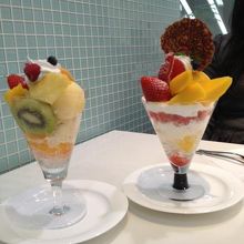 写真は 定番フルーツパフェと上大岡店限定イチゴとマンゴーの季節限定パフェです。