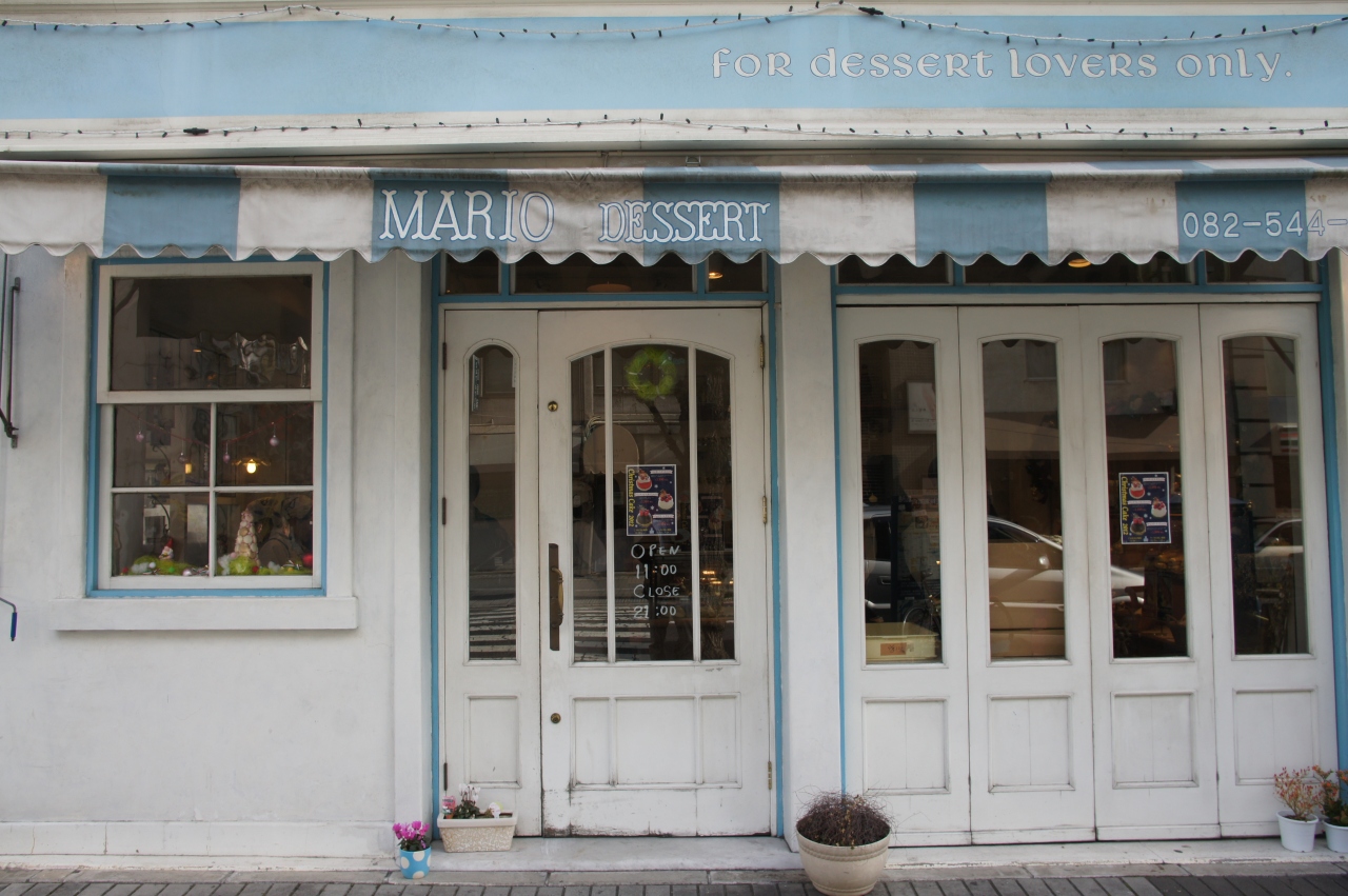 マリオ デザートは、広島市内のショッピングセンターにいくつか出店しているのですが、この並木通りの店舗は独立店舗。ライトブルーの縦じまがおしゃれな店構えです。