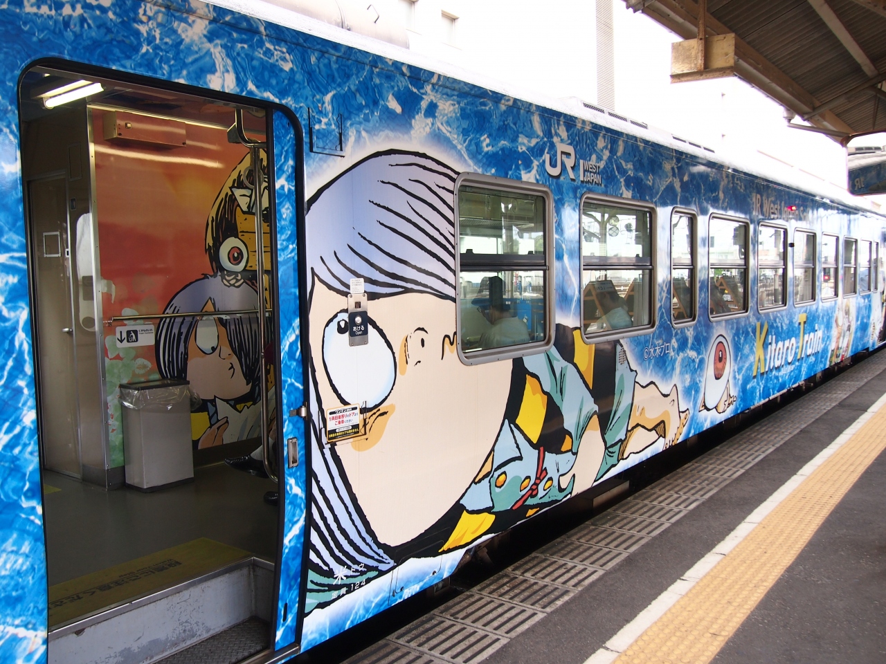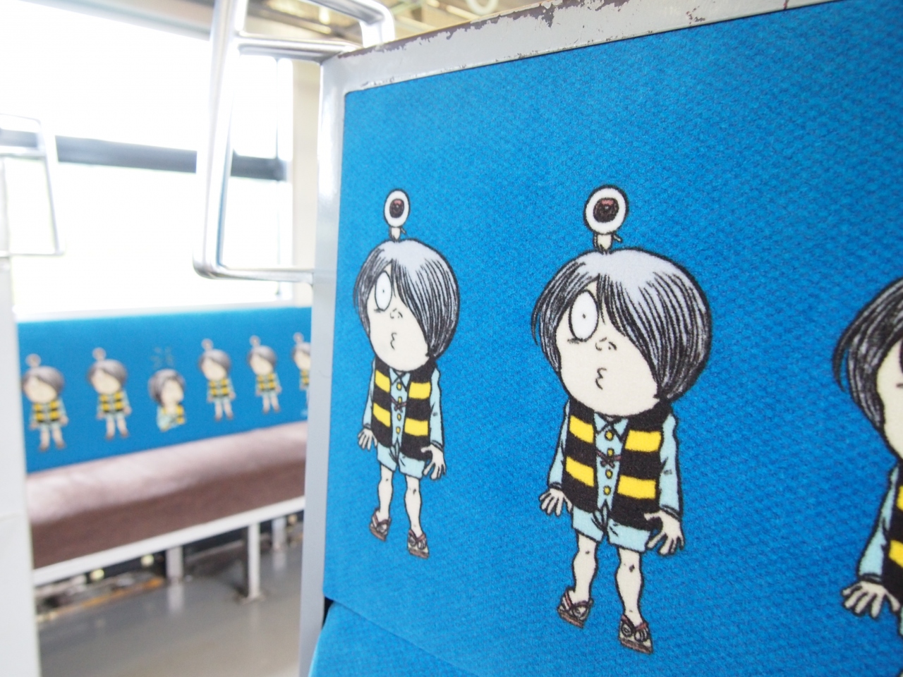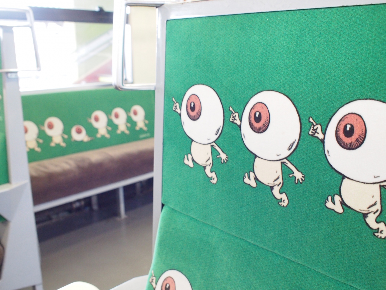 この街に行ったら絶対に乗って欲しいのが、鬼太郎列車。 車体の外側のラッピングだけじゃなくて、内装やシートまでゲゲゲの鬼太郎のキャラクターで、全部で4種類あります。 観光で訪れた際、何度か米子⇔境港を往復して、偶然4種類全部の電車に巡り合えました。