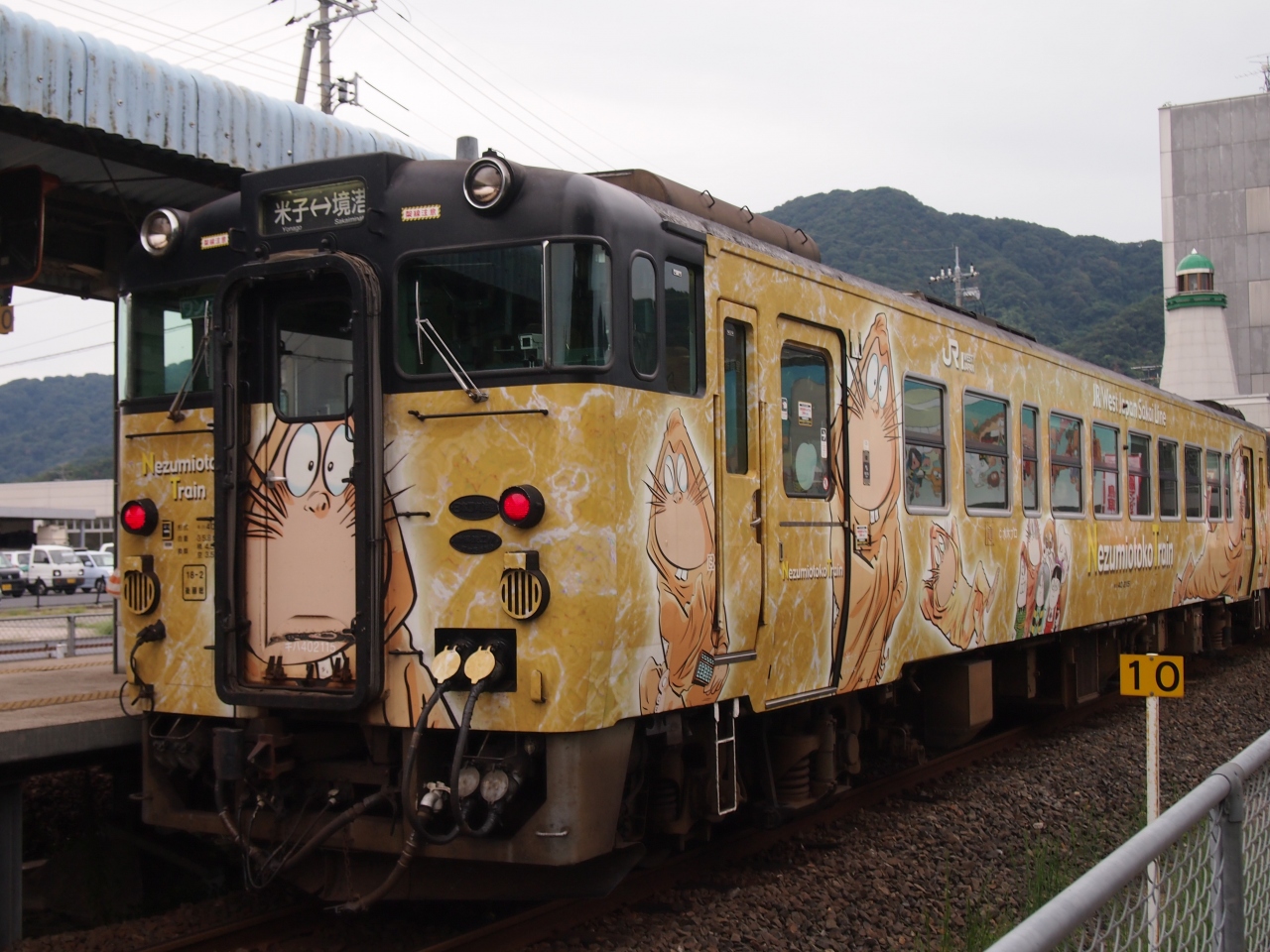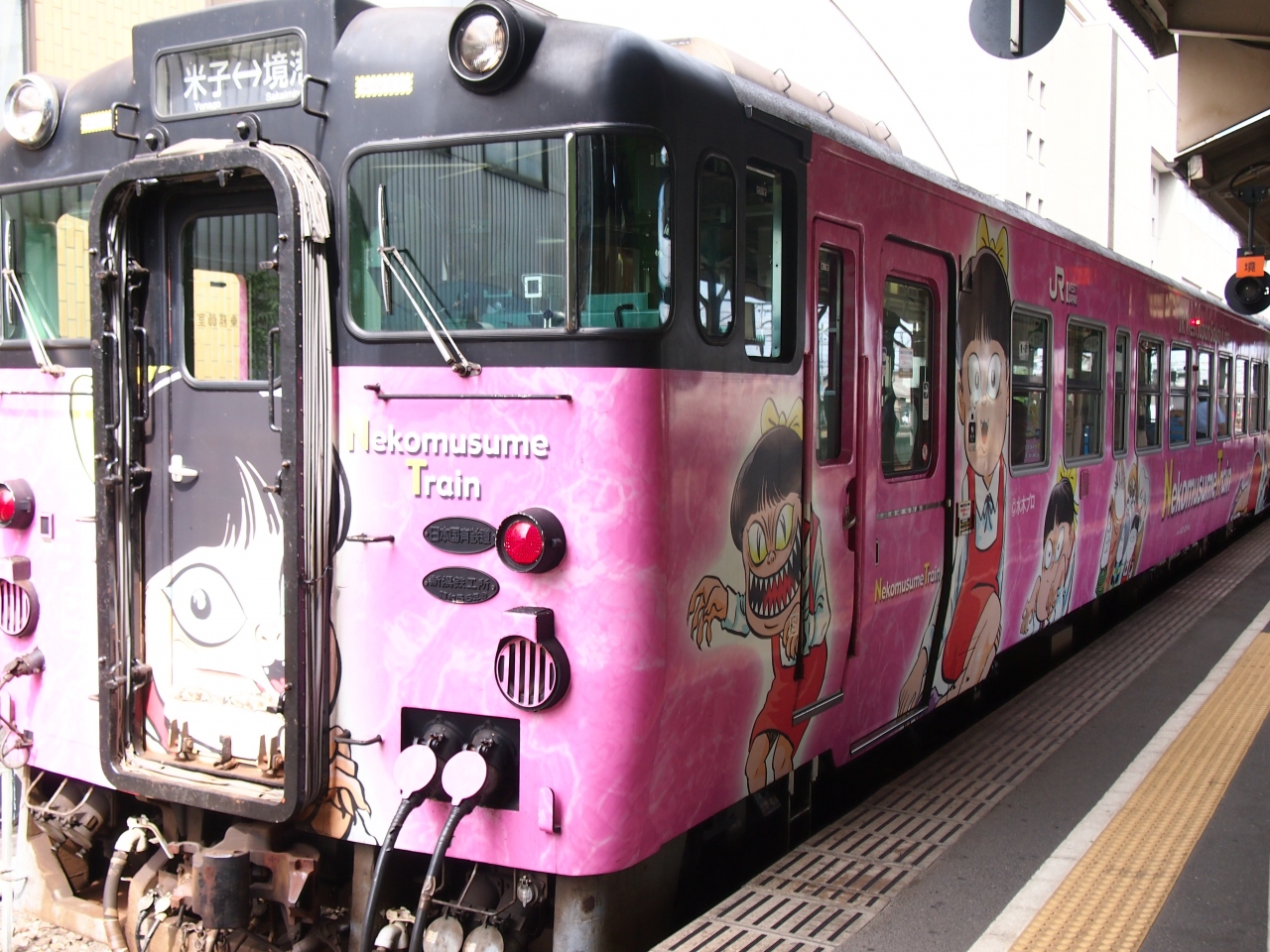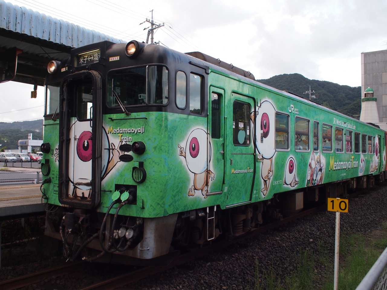 この街に行ったら絶対に乗って欲しいのが、鬼太郎列車。 車体の外側のラッピングだけじゃなくて、内装やシートまでゲゲゲの鬼太郎のキャラクターで、全部で4種類あります。 観光で訪れた際、何度か米子⇔境港を往復して、偶然4種類全部の電車に巡り合えました。