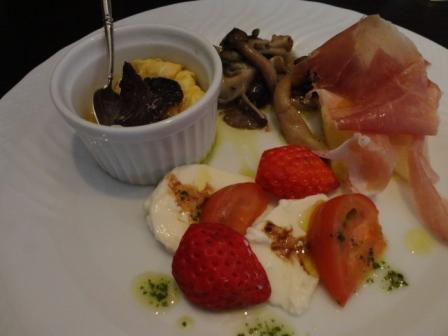 HPにも掲載されているこのお店のイチオシメニューと思われる「トリュフのオムレツ」のほか、カプレーゼ、茸のマリネ、生ハムの盛り合わせです。