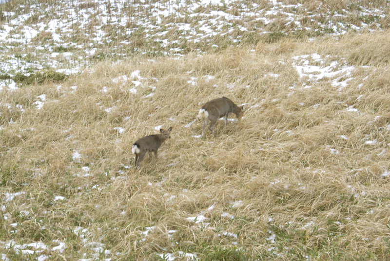 Bコースの高架木道を歩いていたら、草原にエゾシカ親子が遊びに来ていました。