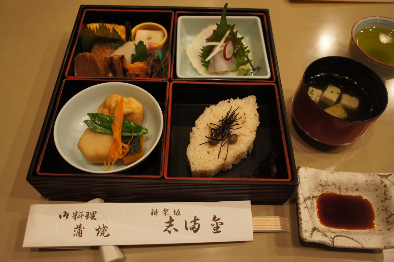 かぐら坂 志満金は、かぐら坂の入り口。うなぎの名店なのですが、今回は、幕の内弁当をいただきました。老舗だけに、椅子がビロード張りだったり、店内はなんとも歴史を感じます。大阪だとはり重のような感じですね。