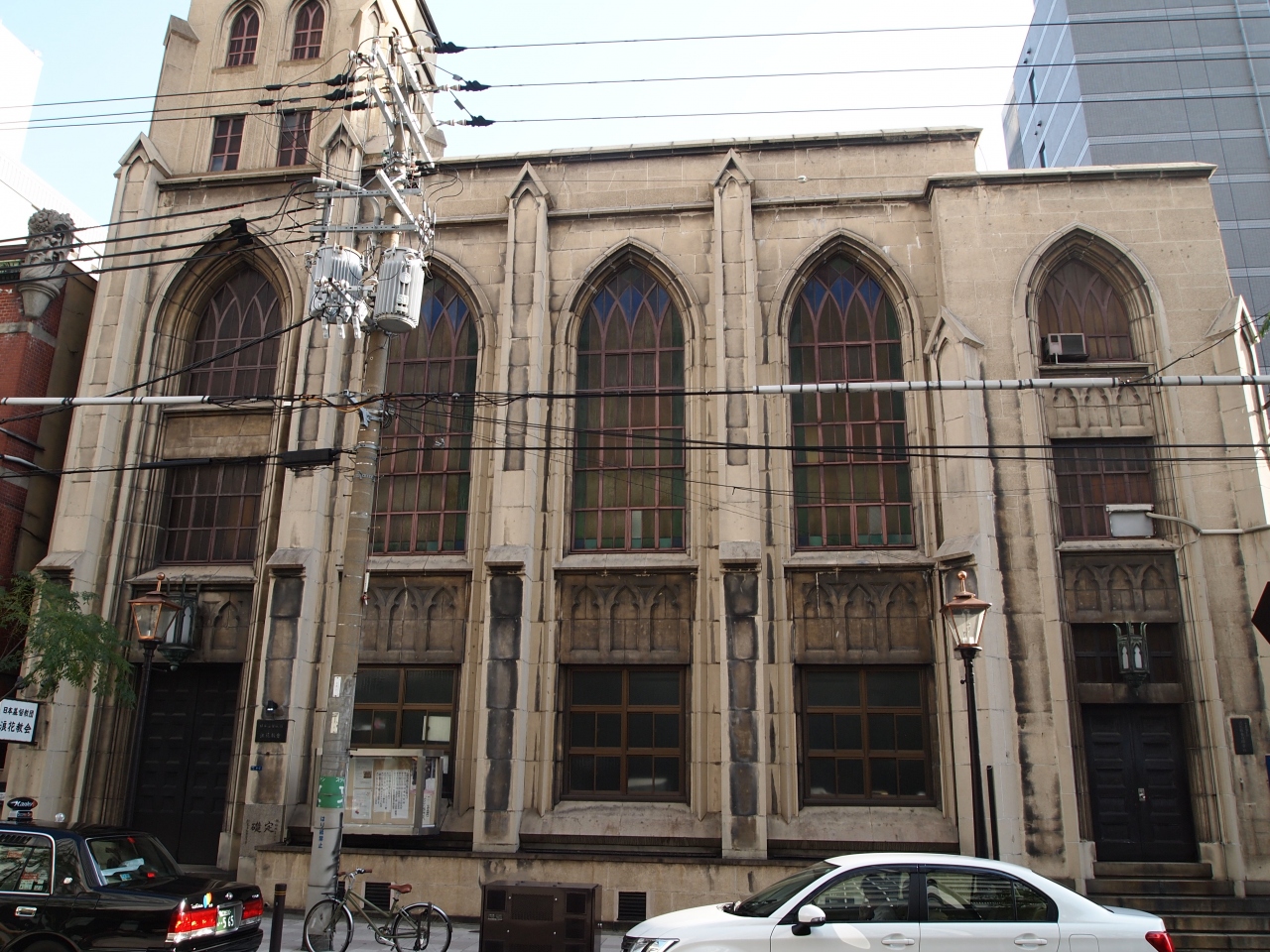 日本基督教団浪速教会は淀屋橋駅と北浜駅の間のビジネス街にあります。