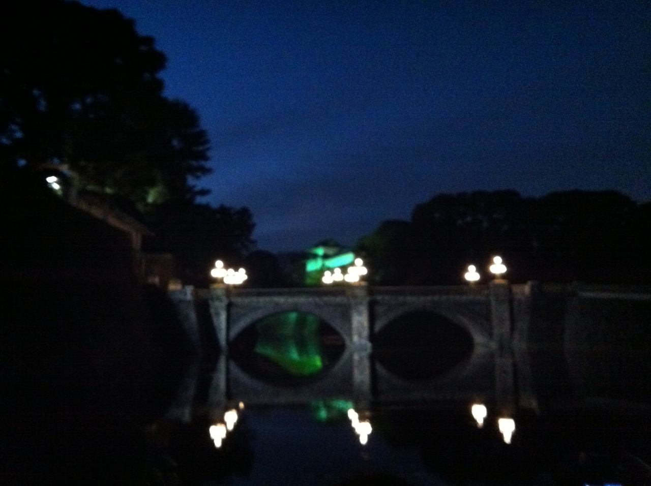 かって一般参賀でこの橋を渡ったことはあったのですが、今回は日没後で周囲は暗く、この橋だけがぼんやりと暗闇のなかで浮かび上がっていました。