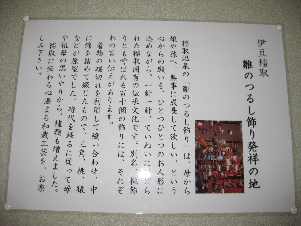 子や孫の成長を願う優しい暖かい心を込めた伊豆稲取の風習=雛のつるし飾りは、桃の節句に赤いひもで雛壇の両脇に1つ1つ意味ある形をつるして、娘の無病息災・良縁を願うこの町独自の伝統であり、全国でも珍しく九州柳川・山形酒田・伊豆稲取の三地区に残る他では見れないものとあって、端午の節句=つるし端午の福まつり『4月〜6月』もあるようで、是非、機会あれば訪れてみてください!