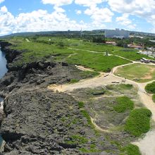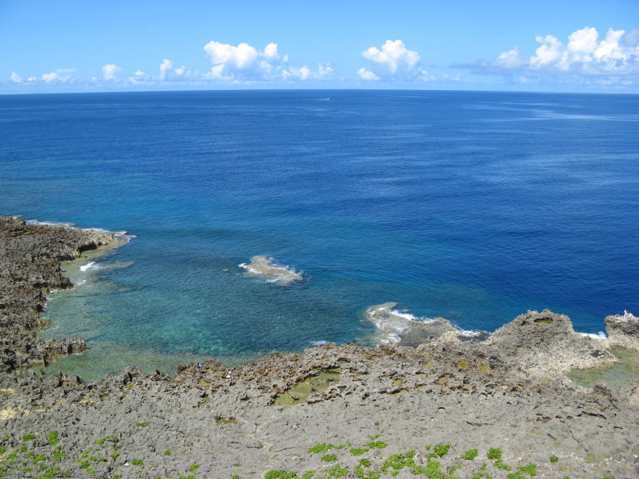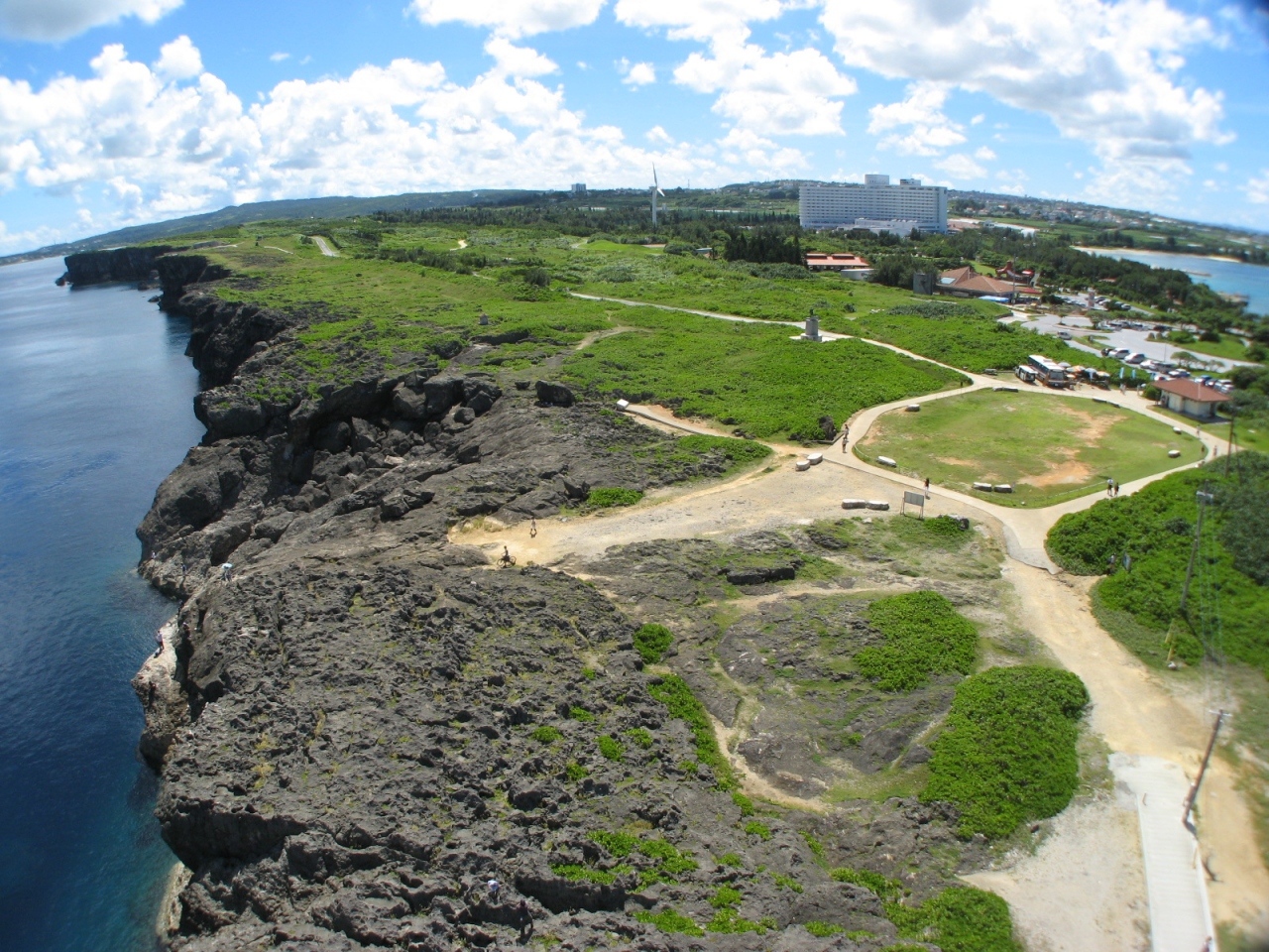 那覇から国道58号線を通っておよそ1時間、読谷村にある「残波岬」は東シナ海に面した岬で高さ約30mの断崖が約2km続いています。磯釣りやダイビングのポイントとしても有名なスポットで、晴れた日は慶良間列島などを眺望できます。周囲は遊歩道が整備されておりゆっくりと散策できました。岬の先端まで行くには遊歩道を外れて、ゴツゴツした岩の上を歩くので結構大変ですが、先端から綺麗な海を覗き込むのも、吸い込まれそうで面白かった。岬の端にある灯台(大人150円)に登るのは少ししんどかったですが、東シナ海の素晴らしい景色を楽しむことが出来ました。
