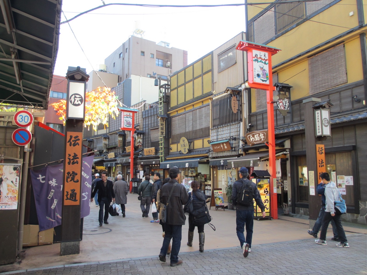 仲見世からオレンジ通りまで伝法院に沿って広がる、俗に「伝横」と呼ばれる延長150mの通り会で、同一間口の非常に個性的な店舗が31店舗連なる有名な通りです。気をつけて歩けば、天水桶や火の見櫓、鼠小僧まで見つかるらしいですが、この時は分かりませんでした。