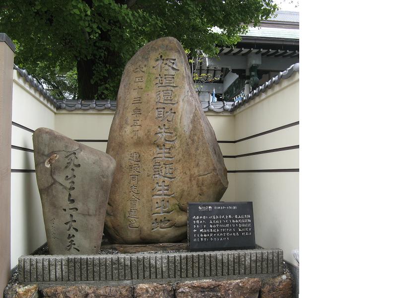 板垣退助の生誕の地を記念した石碑が高知市本町の高野寺門前にあります。板垣は、天保8年4月17日、高知城下中島町に馬廻格乾正成の長男として生まれ、自由民権運動を推進して、明治14年自由党を結成して総理になりました。東海地方遊説中に刺客に襲われ『板垣死すとも自由は死せず』という名言を発したことでも良く知られています。