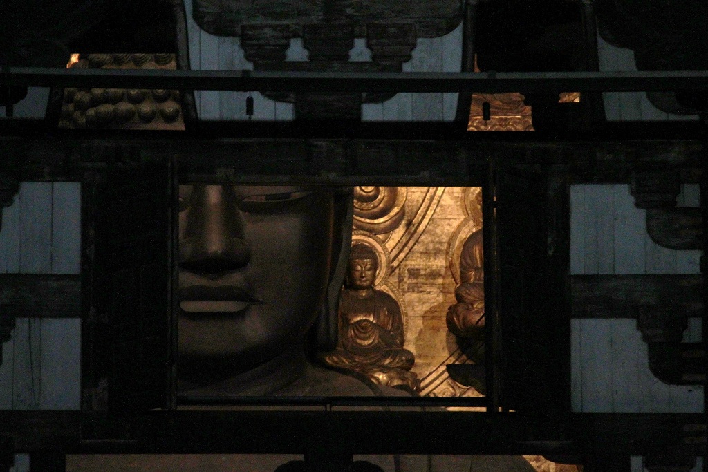東大寺の大仏殿には、「観相窓」という窓があり、元日と8月15日にはその窓から大仏様の顔が拝むことができる。年に数時間だけのチャンス。大仏殿の初詣は大変込んでいるので4−5時くらいが狙い目です。大仏殿に入ると前に大仏の顔が見えます。ありがたいことです。夜の大仏殿もなかなか素晴しい。闇の演出が最高に素敵です。 動画 http://youtu.be/EUKgydLL9Es