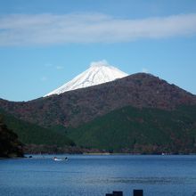 桃源郷港から箱根町港へ行く途中右後ろに富士山が見えます。