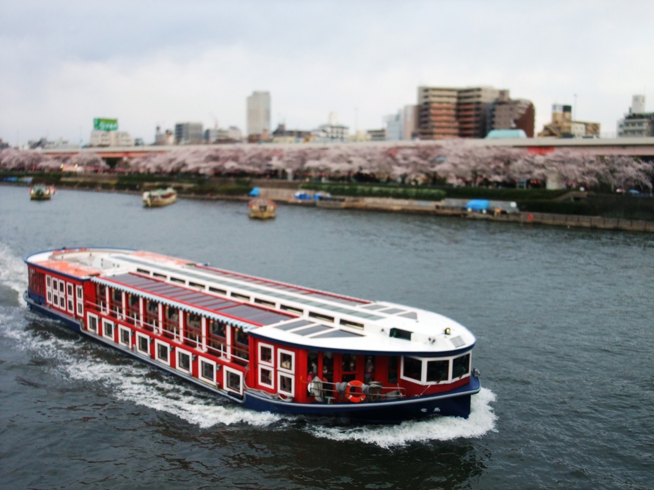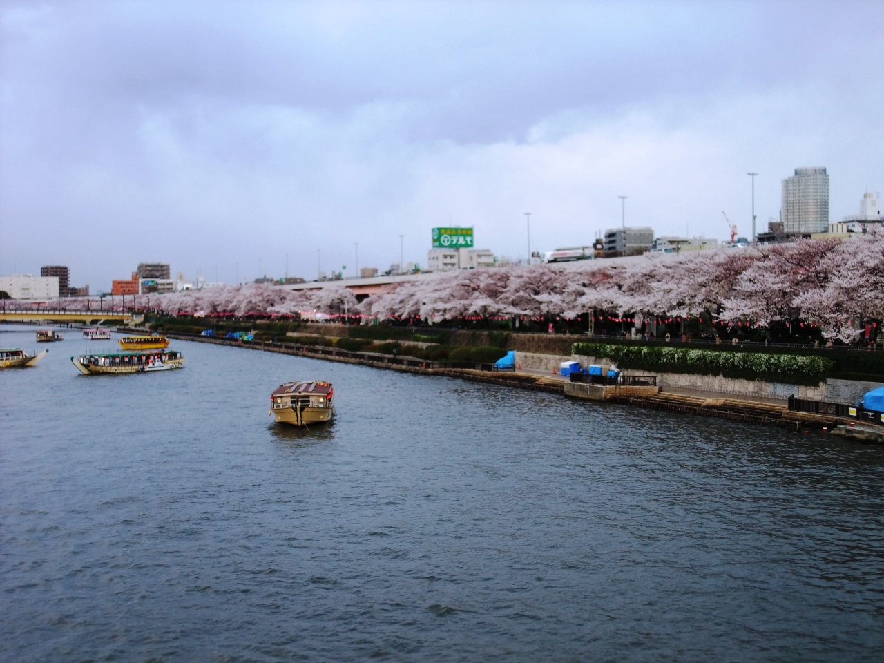 東京の川と言えば、この隅田川だと思います。4月に川沿いの桜が満開になると大勢の観光客が来て、花見のスポットになります。浅草方面からは満開の桜とスカイツリーを見ることができ、夜は屋形船で夜桜見物も可能です。