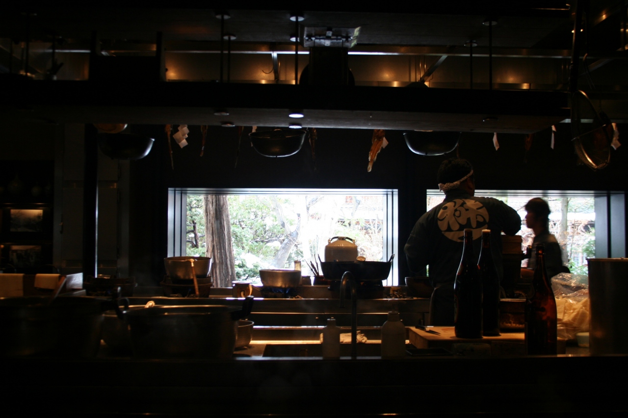 オープンキッチンというか、カウンターに囲まれた台所でいきな男衆が料理をしてるのが見られます。