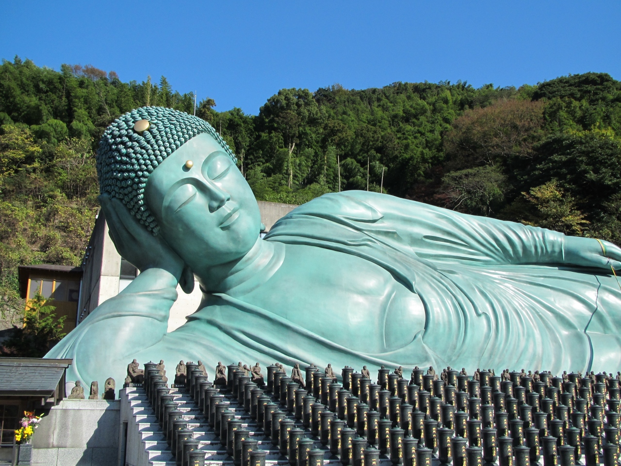 南蔵院は篠栗四国霊場の総本寺で、高野山真言宗の別格本山でもある。平成7年に釈迦涅槃像が建立された。全長41m、高さ11m、重さ300トン、ブロンズ製の涅槃像としては世界最大。その涅槃像の体内には仏舎利(御釈迦様のお骨)が安置されています。お蔭様で年間120万人の観光客がお参りしています。