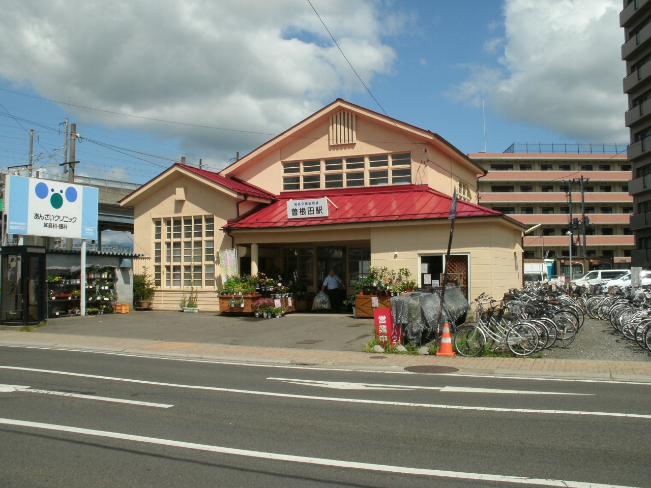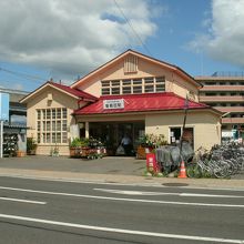 ベージュ色の壁が印象的な駅です。福島駅からわずかに600mという位置にあるので、周囲はにぎやかな市街地です。ショッピングセンターも近くにあって、駅から徒歩で行くことができます。駅前の道路も交通量が多くなっています。