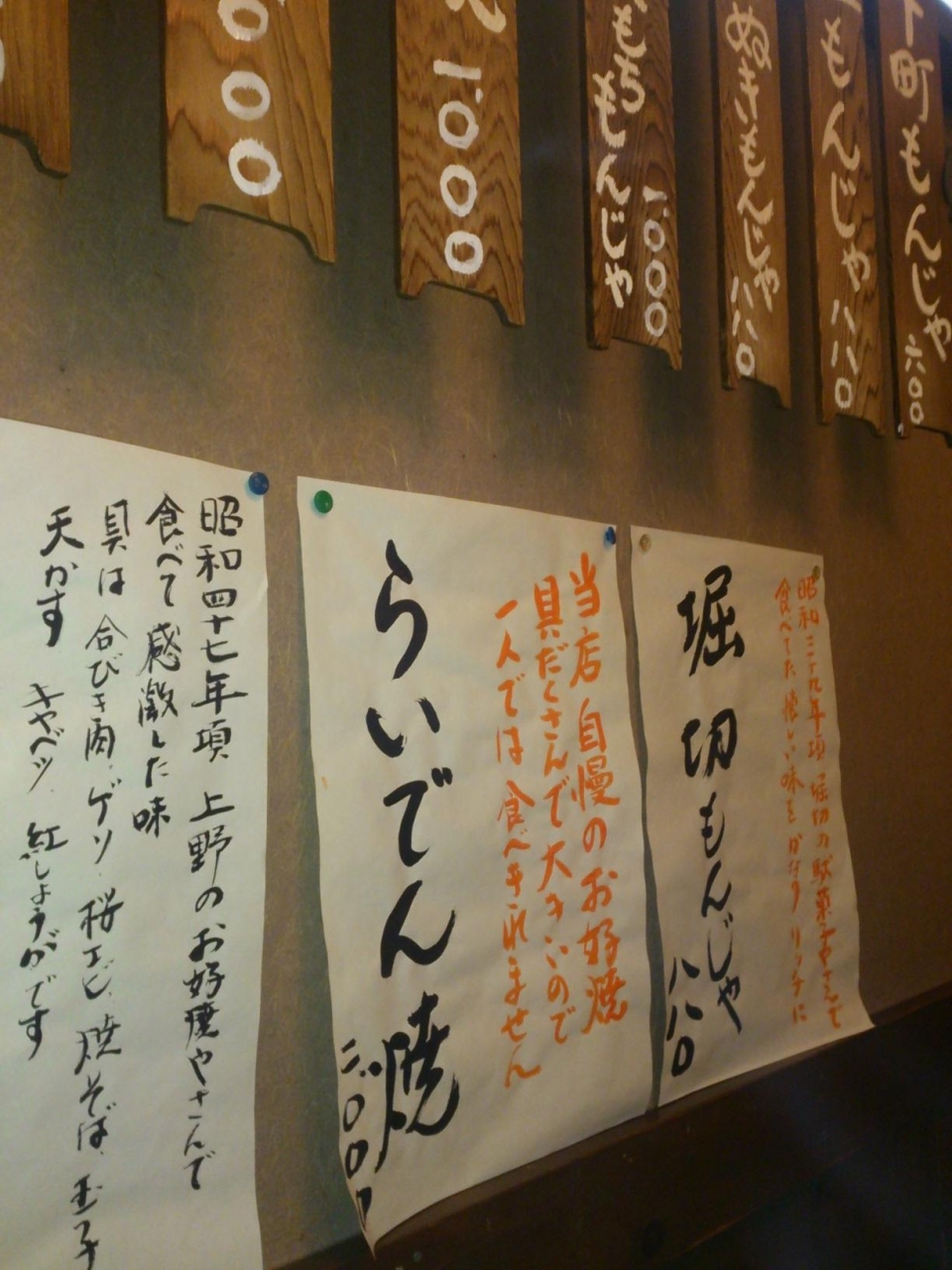 壁一面にはずらりとお品がきがあり、もともと席においてあるメニューにないものばかりで、何がメインなのかはちょっとわからなかったのですが、串焼きやお好み焼き?が大きめに書いてあったかなー