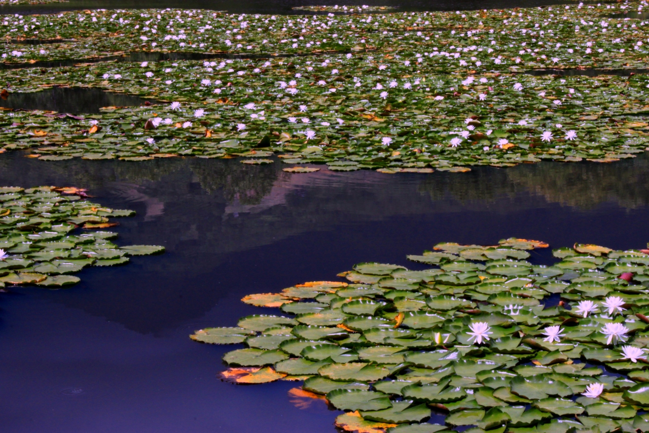 9月初めに訪れた時はいもり池は白い睡蓮がいっぱい咲いていました。