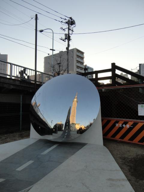 南は錦糸町駅近くから1.8kn続く親水公園です。途中無料の魚釣り場などもあります。スカイツリー近くは北の端になります。ソラマチのスカイツリー駅方面の出口近くの交差点を渡り、東武橋を過ぎ歩いていくと業平橋のたもとにあります。ここで面白いのはスカイツリーの全景が映る鏡です。自分の姿を入れて記念写真を撮っている人がいました。