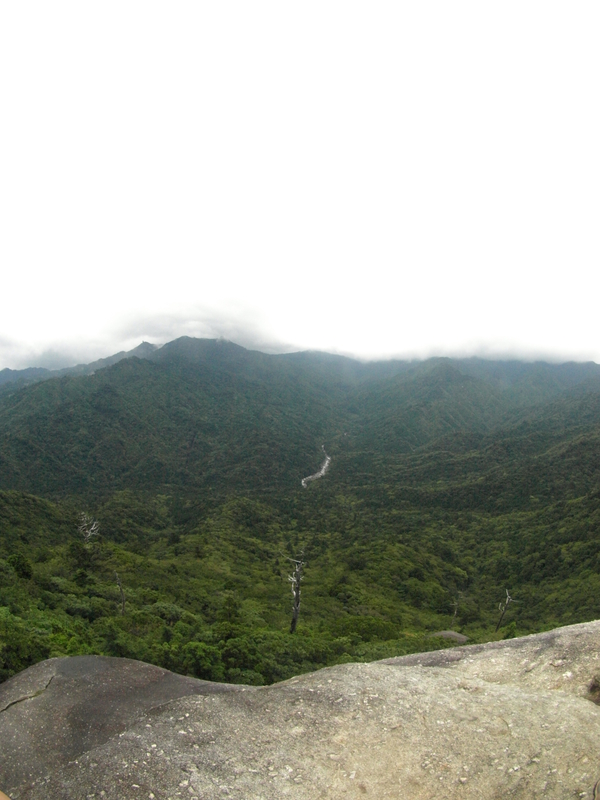 白谷雲水峡の観光を予定し、前日に泊まった宿の主人のすすめで、白谷雲水峡からさらに奥にある太鼓岩まで登りました。白谷雲水峡の管理棟から入山し、白谷川沿いの、楠川歩道を登り、もののけ姫の森を通りすぐさらに奥まで行き辻峠で左に曲がり、少し頑張って登ると太鼓岩はあります。太鼓岩は山頂にある巨大な岩で、。うっそうとした森をぬけ太鼓岩に登ると突然目の前の視界が開け、眼下には安房川と屋久島の深い森が、皿のその向こうには島の中央部、奥岳が大パノラマで見れます。