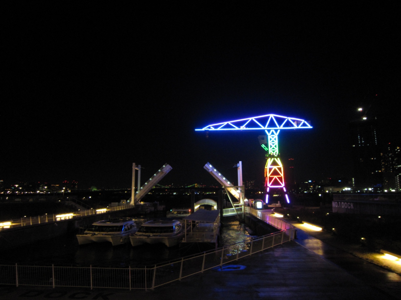 ららぽーと豊洲のシンボル、かつてここが造船所だったことを残すドックとクレーン。夜になるとクレーンとドックを渡る跳ね橋が綺麗にライトアップされます。建物側から見る景色もいいですが、海沿いの公園を歩けば、ライトアップされた海の奥にビル群の灯り、遠くお台場方面に葉レインボーブリッジも見えて綺麗です。以前なら、ビルの合間から東京タワーも見えましたが今では新しいビルが出来て見えなくなってしましました。