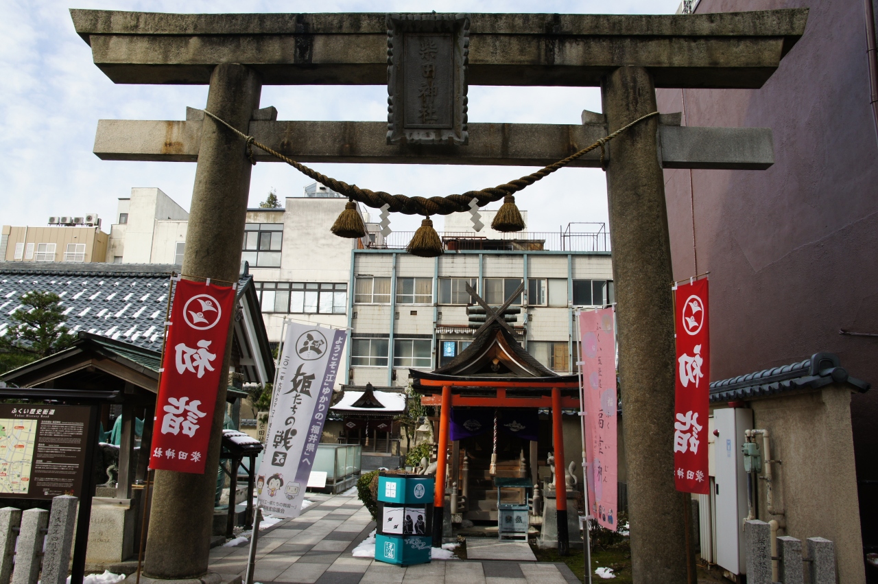 柴田神社は、柴田勝家と妻の市を祀る神社。隣りには、三人の娘を祀る三姉妹神社もあって、小さなスペースに寄り添うように、勝家の銅像のほか、市、三姉妹の銅像が建っています。