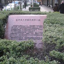 新橋演舞場と道を隔てた隣は日産自動車の本社ビルです。道路の歩道の植込みに埋まるように赤い大理石の碑が建っていました。