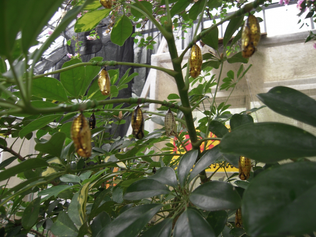 蝶のビニールハウスがあり、金色の蛹が美しかった。