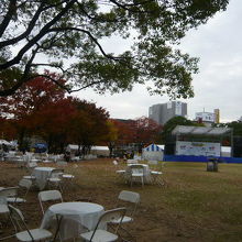 福岡市役所の東側、緑に覆われた建物のアクロス福岡に面しているのが天神中央公園です。川沿いには桜並木があり、桜のトンネルをくぐることが出来ます。中央にある芝生広場はとても広く、私が訪れたときは福岡マラソンの事前イベントが開かれていて、多くのテントが並び、テーブルや椅子も置かれていました。