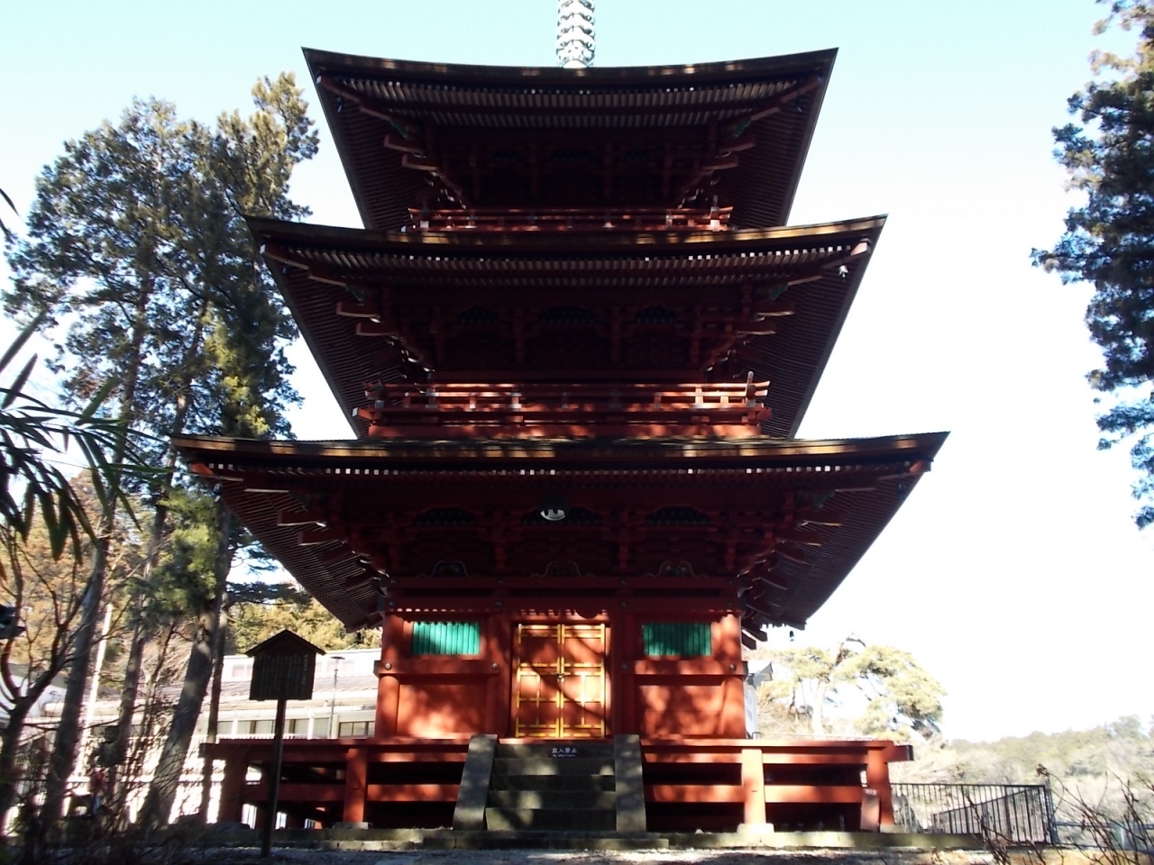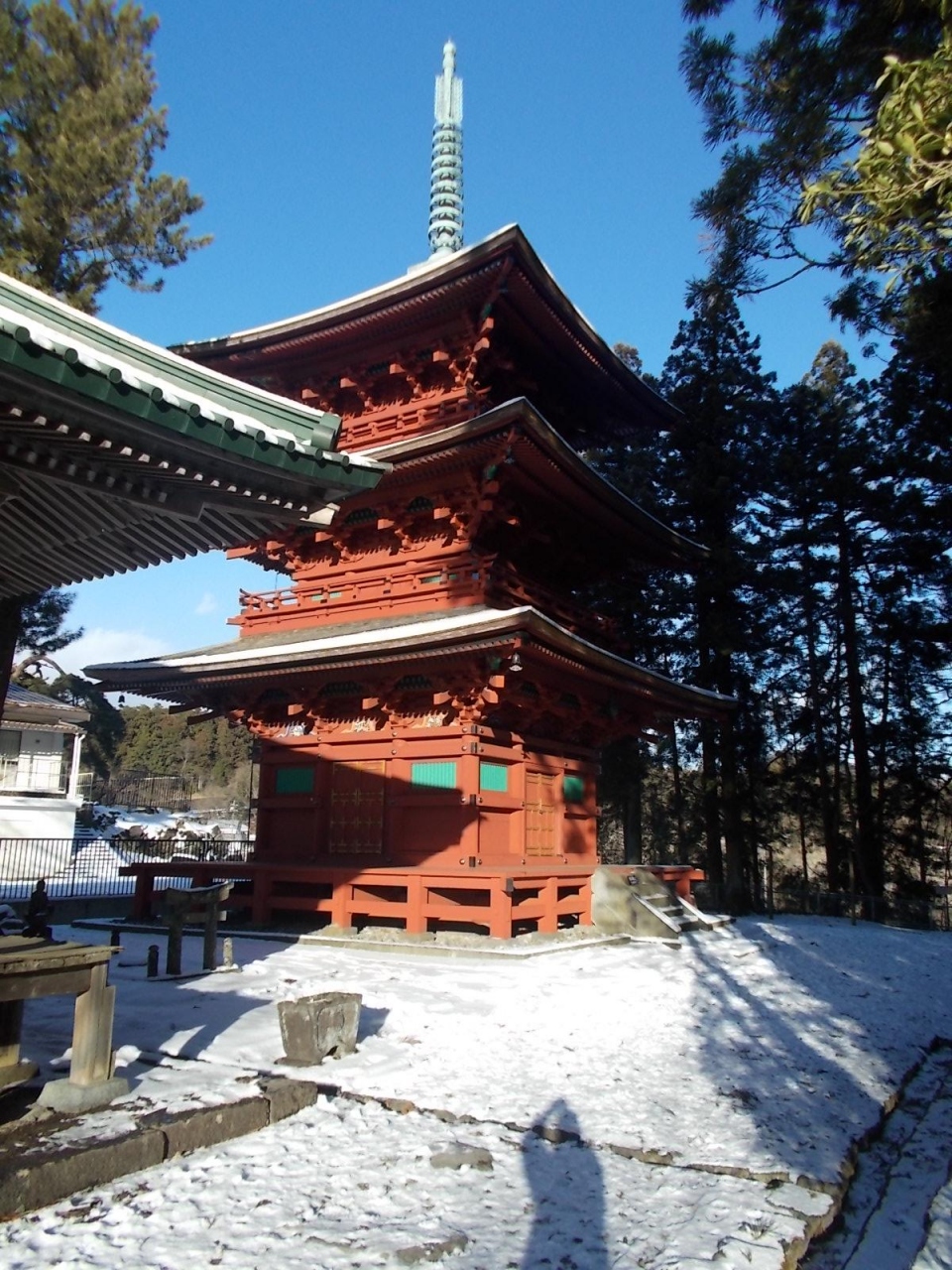 四本龍寺三重塔(写真添付) ; 将軍源実朝の供養のために仁治二年(1241年)に東照宮境内付近に建立され、その後この地に移された。