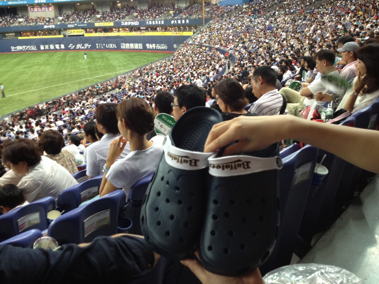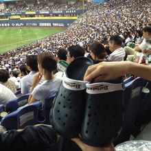 マニュライフ生命関係のチケットで観戦~。添付写真のサンダルを無料でゲットしました!なかなか高品質でした。ドーム内はちょっと暑かったけど、ビールが美味しかった。たまたま沖縄フェアをやっていて、ゴーヤチャンプルなどいただけました。