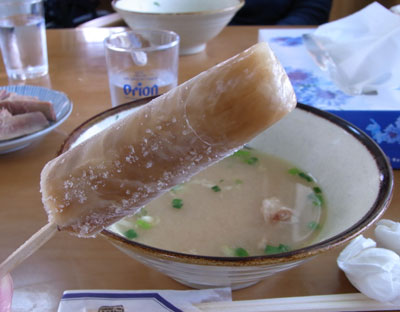 宮古そばの人気店です。有名人の方の来店も多いらしく、店の壁にたくさんの写真が貼ってありました。若干くせのある味だったので、好き嫌いが分かれるかもしれません。宮古島に行ったら一度は食べてみて!食後に黒砂糖水を凍らせたアイスキャンディーがサービスされます。棒を持って差し出されたので、ちょっとビックリしましたが、後口がさっぱりとしました。