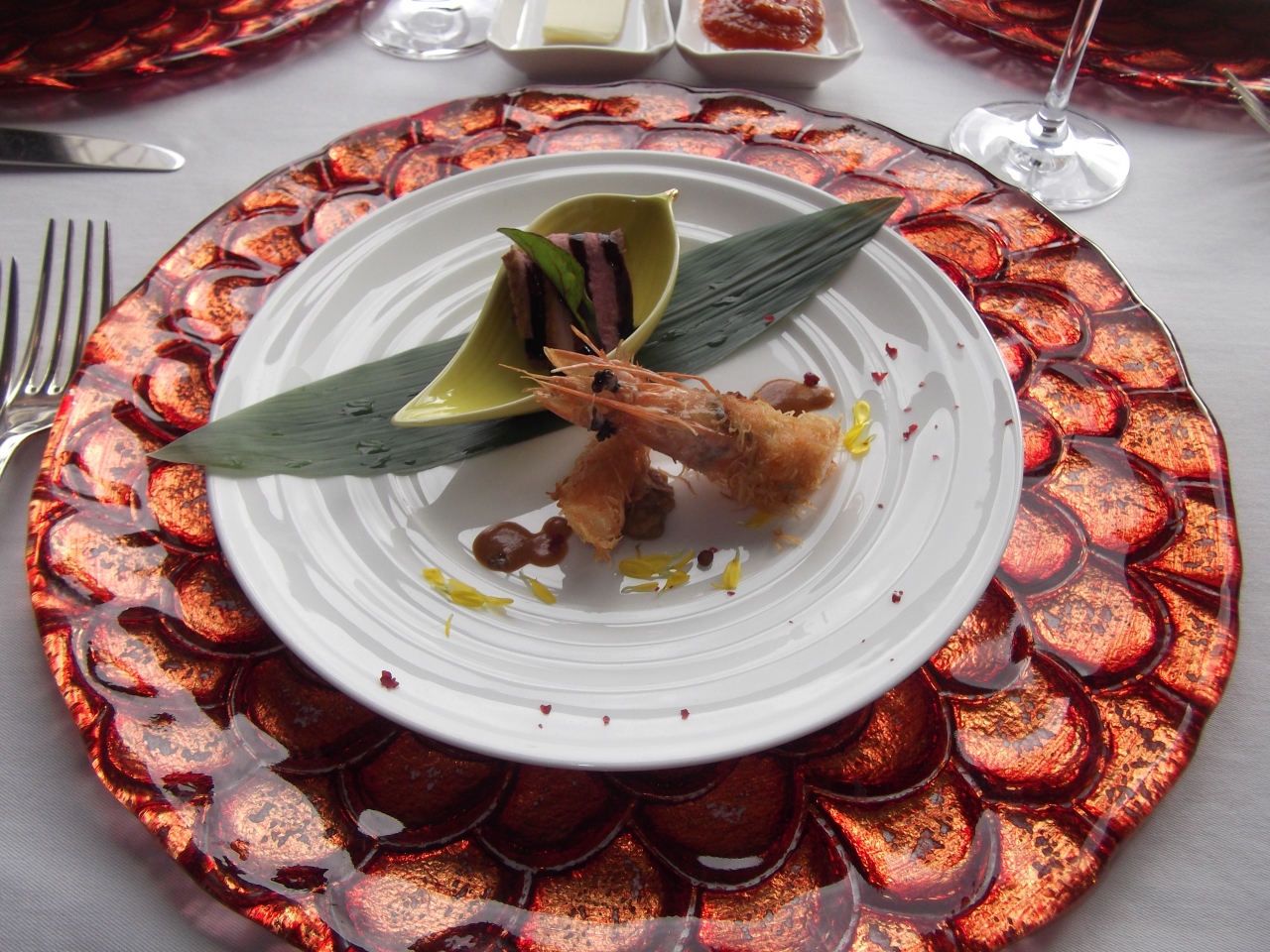 お料理は海老と鴨のプチオードブル、牛蒡と金時人参のスープ、