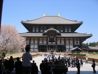 大仏さんで有名な東大寺。世界遺産にも登録されており、いつも観光客でにぎわっています。桜の季節は、氷室神社や浮見堂が道路沿いのせいか際立っている感じだったのですが、東大寺の境内にもかなりたくさんの桜の木が植わっています。大仏殿と桜が一緒に撮れる場所は、カメラを持った人たちが順番待ち状態でした。