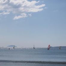 砂浜で遊ぶ子供たちだけでなくマリンスポーツを楽しむ人が沖合いに沢山います。