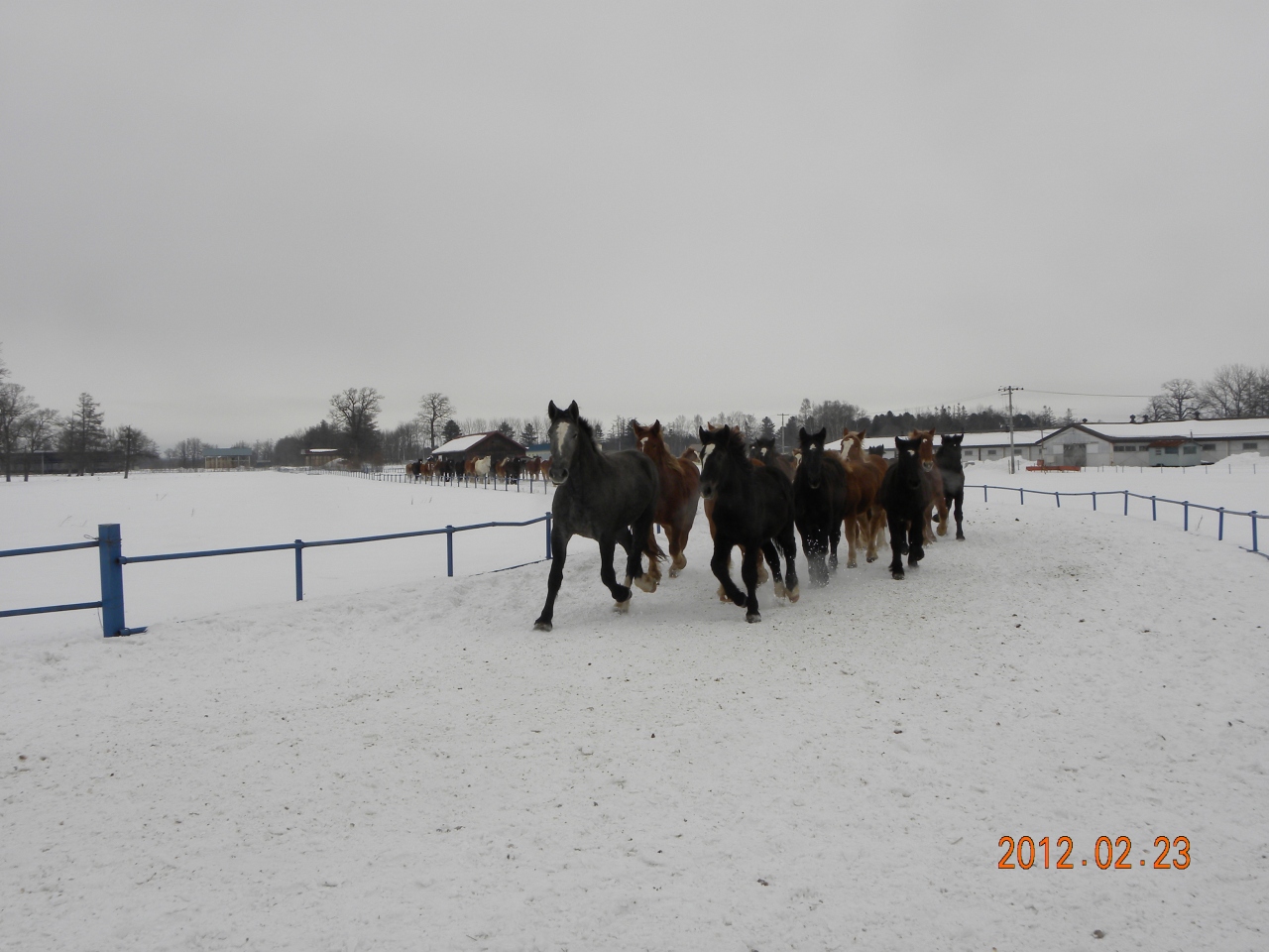 おなかが大きい妊娠した馬が、難産防止の為に、雪の馬場を白い息を吐きながら疾走します。