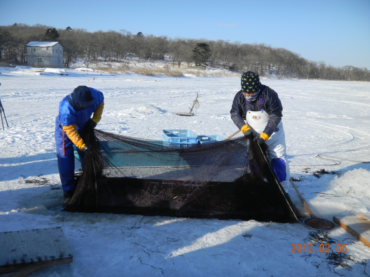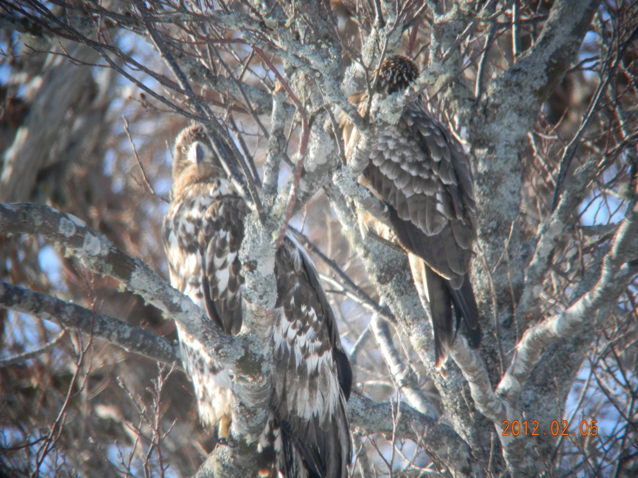 全面結氷した風蓮湖に行き、氷下待網漁(氷に四角い穴を開け、氷の下に網を仕掛けて行う漁)を見学した時、廻りの木々に沢山のオジロワシを見かけました。