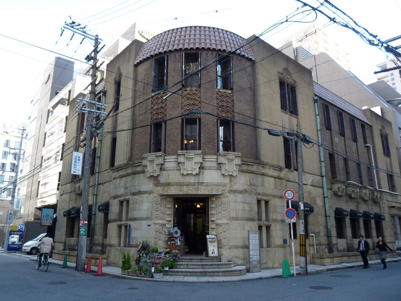御堂筋から一本東へ入った道にある昭和初期に建てられたレトロな建物です。現在では1階が飲食店になっており、昼時には近くにお勤めと思しきOLさんたちがランチを楽しんでおられました。壁の色とかが少し色あせているところも哀愁を誘いますね。