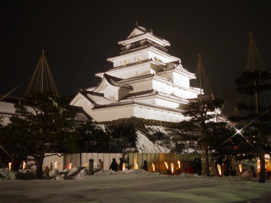 鶴ヶ城の天守閣がライトアップされるほか、城址公園に絵ろうそくの明かりが灯ります。
