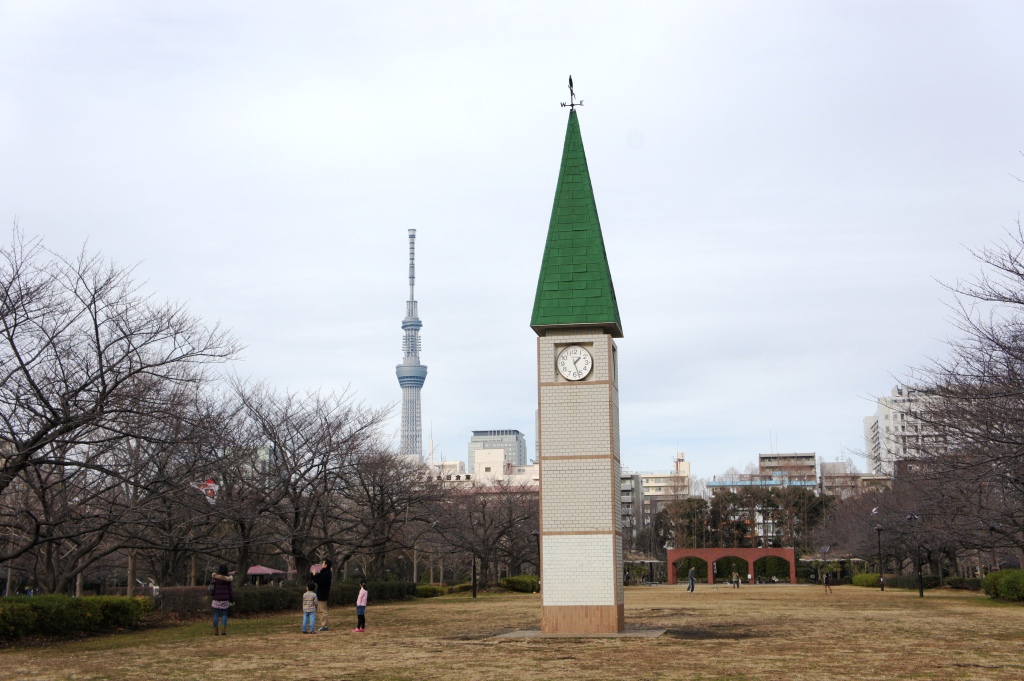 新大橋を渡り江東区内を走っていると、通り沿いの左右に大きな公園が見えてきました。向かって右側には野球場、左側には芝生の広場が広がり、散策する親子連れの姿も目立ちます。猿江恩賜公園です。元々、こちらには江戸時代以来の貯木場があり、1976年に木場に移転するまで材木が浮いてました。向かって左側の芝生広場にはシンボルの時計台が立ってますが、やっぱり気になるのはその向こうに見える東京スカイツリーでした。広場になってる分、とってもよく見え、夜などツリーが見える隠れ家スポットになりそうな感じもしました。