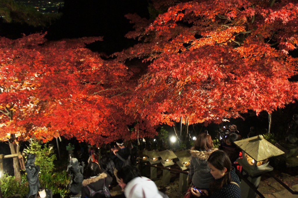 紅葉真っ盛りの大山寺に出かけました。ライトアップされた紅葉は「これぞ見事」というしかないほど、燃えるような赤が印象的でした。とはいうものの、たどり着くのは大変でした。夕暮れに合わせて大山ケーブルで阿夫利神社まで行き、参道を下って大山寺に向かったのですが、電灯はあるもののかなりの暗さ。懐中電灯を照らしながらの急坂下り。沢山の人が歩いており、片方は崖でかなり冷や冷やもの。途中、渋滞さえ起きてました。大山寺に着くと境内とは言えないほど狭い門前はライトアップ見物客でごった返してました。おまけに寒いのなんの。美しい紅葉には見とれますが、寒さと人の多さには・・・などと文句を言ってますが、ホントにきれいでした。