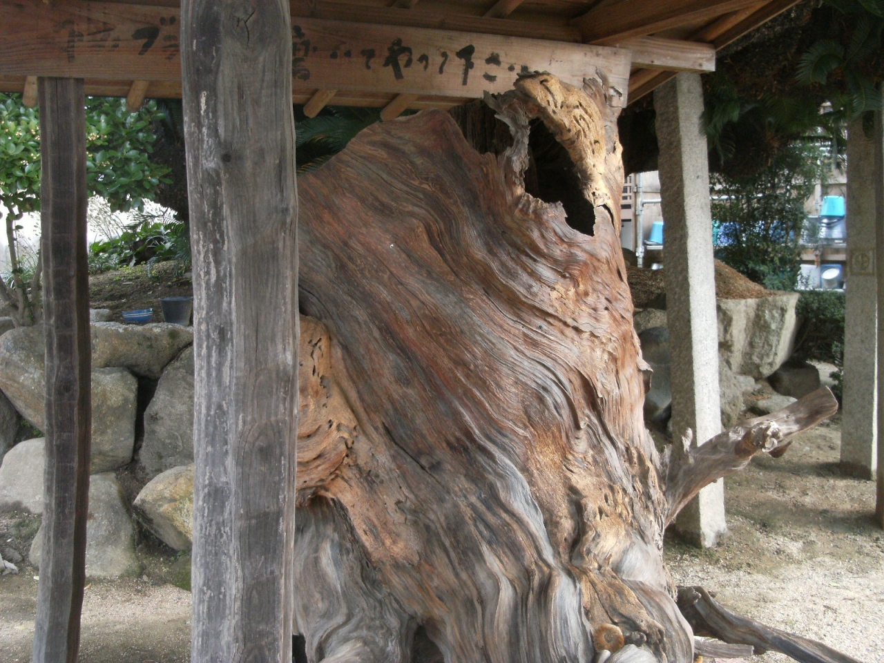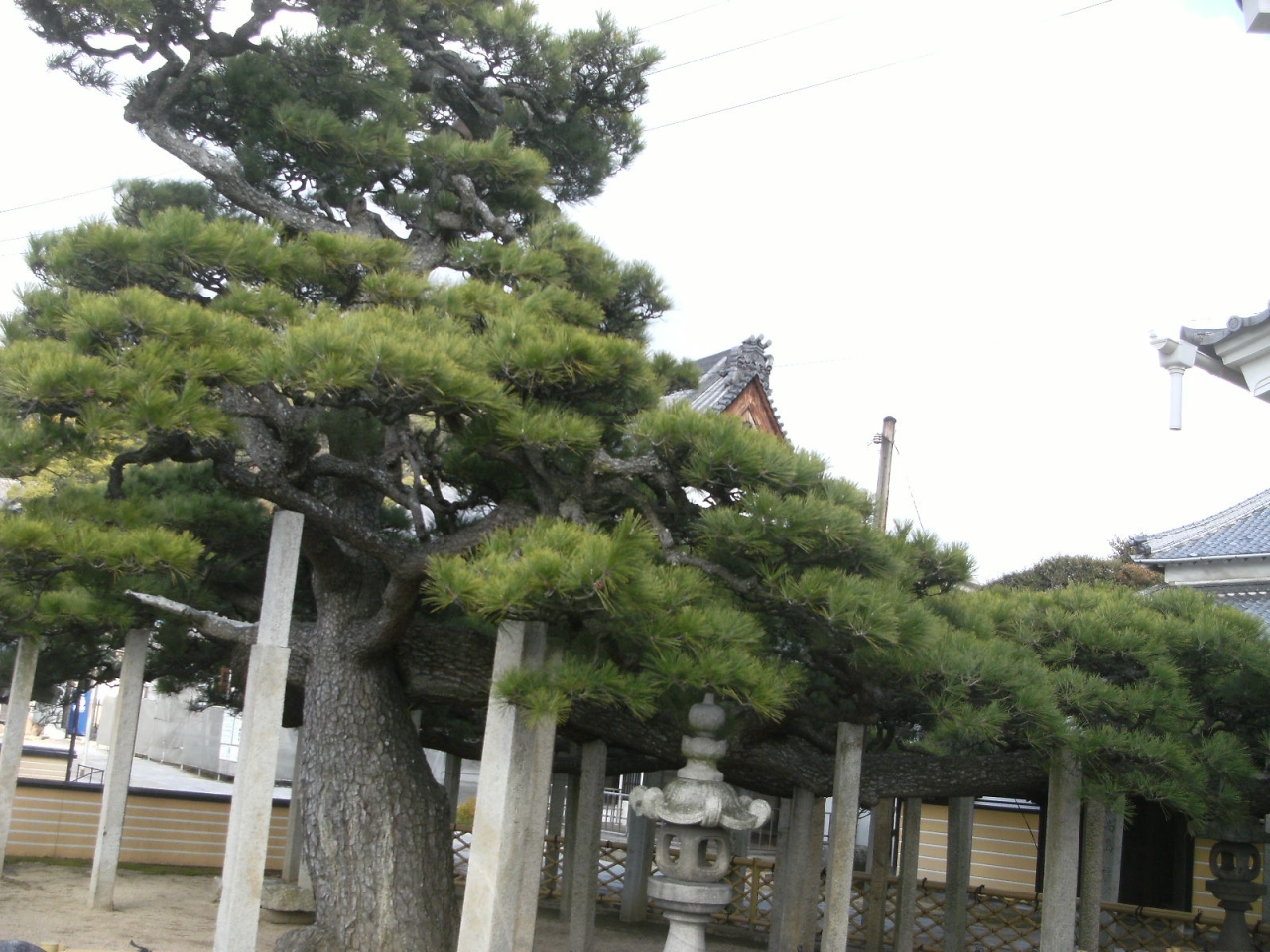 通常あり得ないくらい枝が横に広がった「鷲の松」が見所。たくさんの石柱で枝を支えて辛うじて姿勢を保っている感じで、今までよく台風などを乗り切れたものだと感心します。先代の「鷲の松」らしきものの根株も、近くに飾られています。