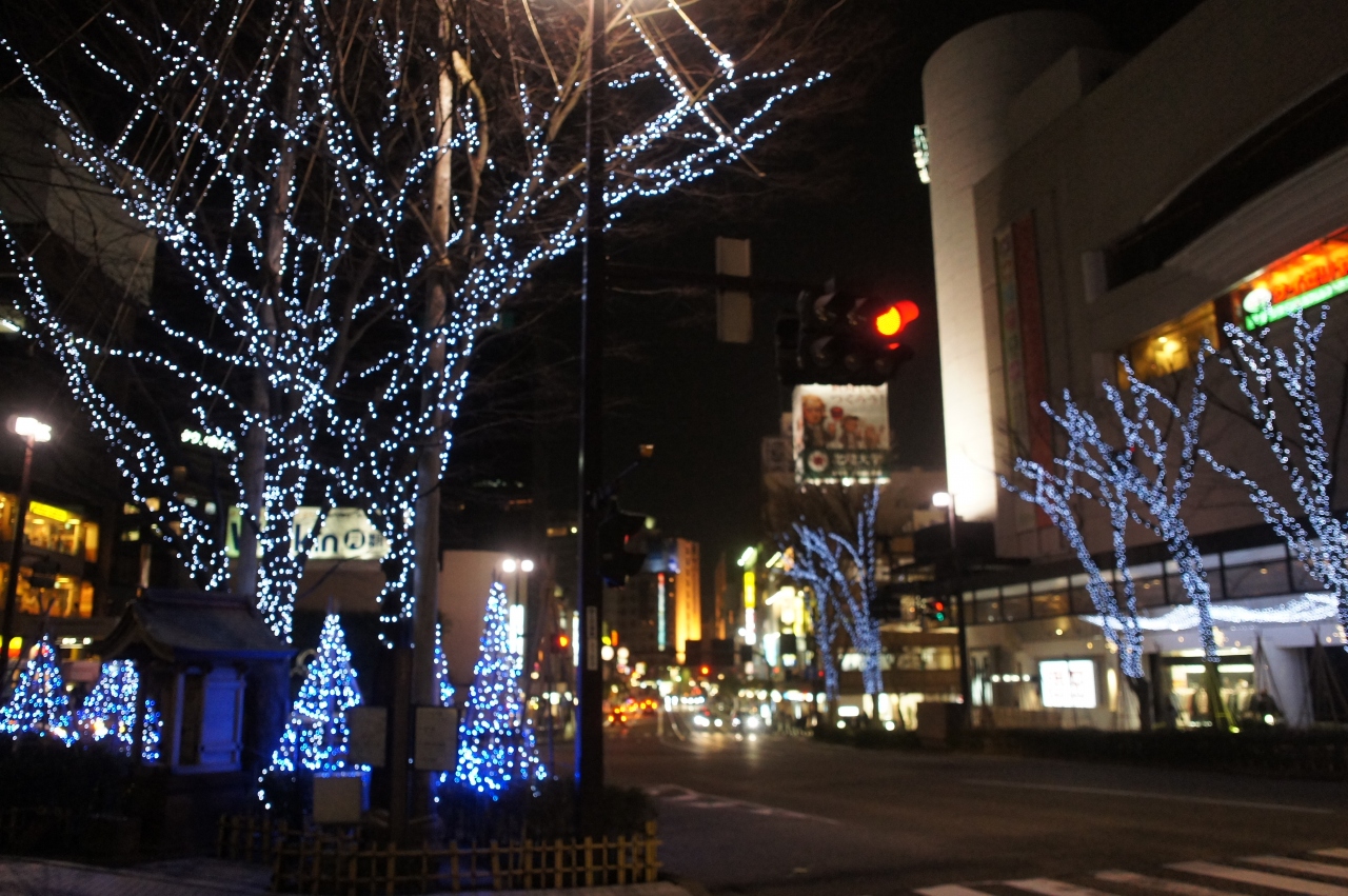 香林坊地区ツリーファンタジーは、香林坊の交差点から、近江市場のある武蔵方面の歩道両側。街路樹のケヤキ36本に約11万球の電球が飾られています。色は、シンプルな青の単色ですが、雪の街では、多彩な電飾は不要でしょう。これくらいがちょうどいい華やかさだと思います。