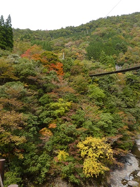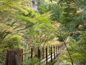 樅木のつり橋は五家荘の紅葉スポットのひとつです。つり橋からの紅葉の眺めは格別です。つり橋は2つあり、あやとり橋としゃくなげ橋というそうです。それほど揺れは感じませんがつり橋好きな方は是非おすすめします。人はまばらでした。駐車場は20台以上可ですが、つり橋への道がせまく離合も難しいので運転が慣れている方がいいでしょう。