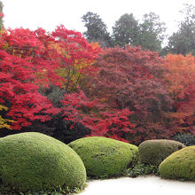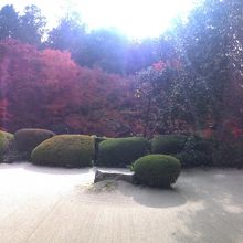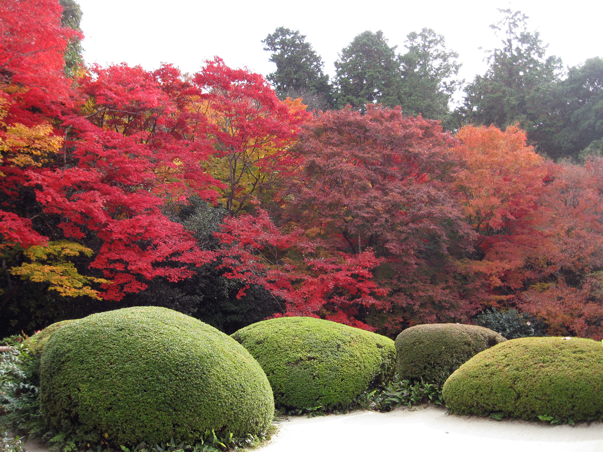 玉状に刈り込まれた緑のサツキ、庭一面を覆う白砂、庭を取り囲むモミジの赤。
